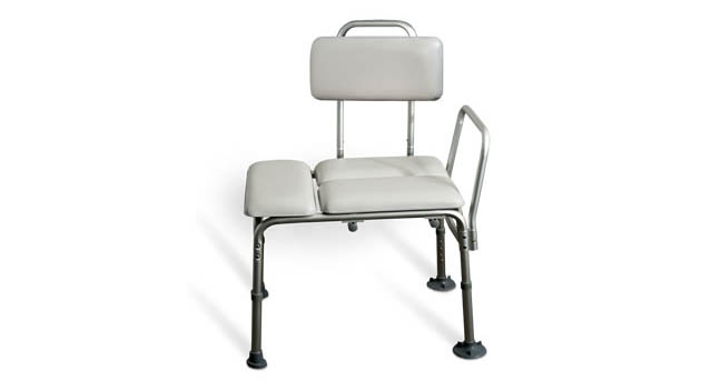Nouveau et amélioré, le siège, encliquetable, s'inverse rapidement et la poignée, amovible par bouton-pression, s'installe et se retire faceilement. Le siège et le dossier sont rembourés avec un revêtement de vinyle, résistant aux taches, et scellé par chaleur. Ce siège de transfert est également muni d'un châssis en aluminium fini satin, d'une base large, de grands embouts antidérapants en caoutchouc et d'une fente pour rideau de douche.